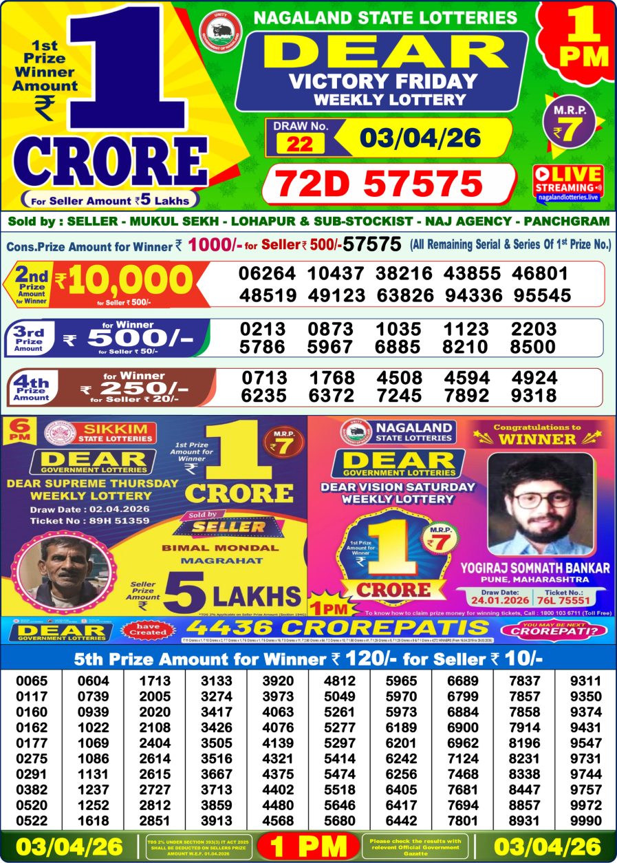 Nagaland State Dear Lottery Result Declared 1PM 03/04/2026 April 3, 2026 Leave a Comment on Nagaland State Dear Lottery Result Declared 1PM 03/04/2026 Posted in Lottery Results