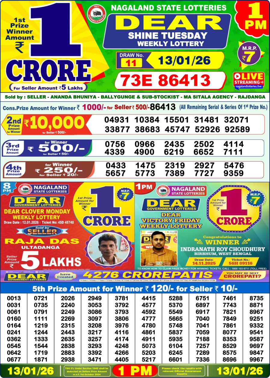Nagaland State Dear Lottery Result Declared 1PM 13/01/2026 January 13, 2026 Leave a Comment on Nagaland State Dear Lottery Result Declared 1PM 13/01/2026 Posted in Lottery Results