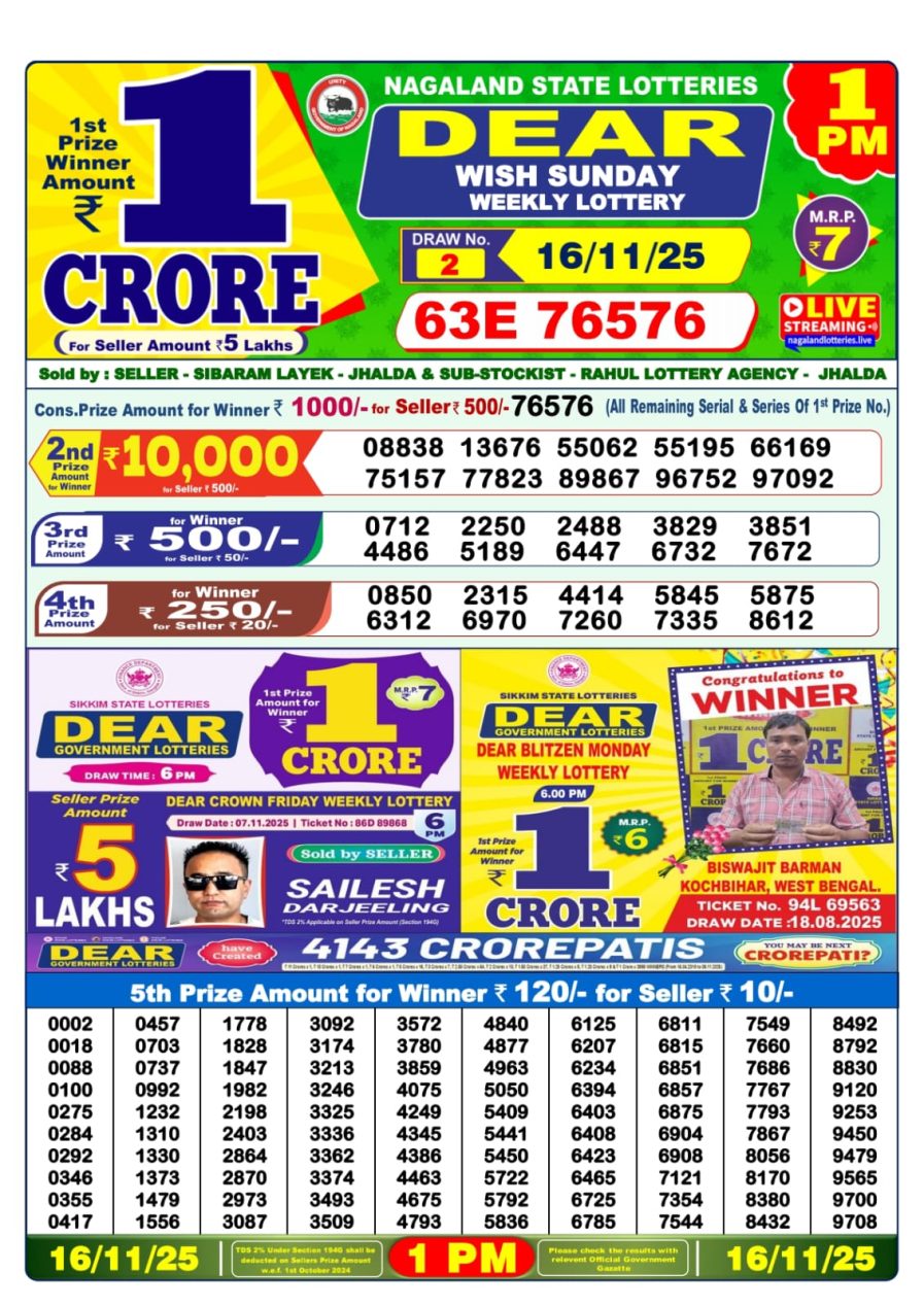 Nagaland State Dear Lottery Result Declared 1PM 16/11/2025 November 16, 2025 Leave a Comment on Nagaland State Dear Lottery Result Declared 1PM 16/11/2025 Posted in Lottery Results