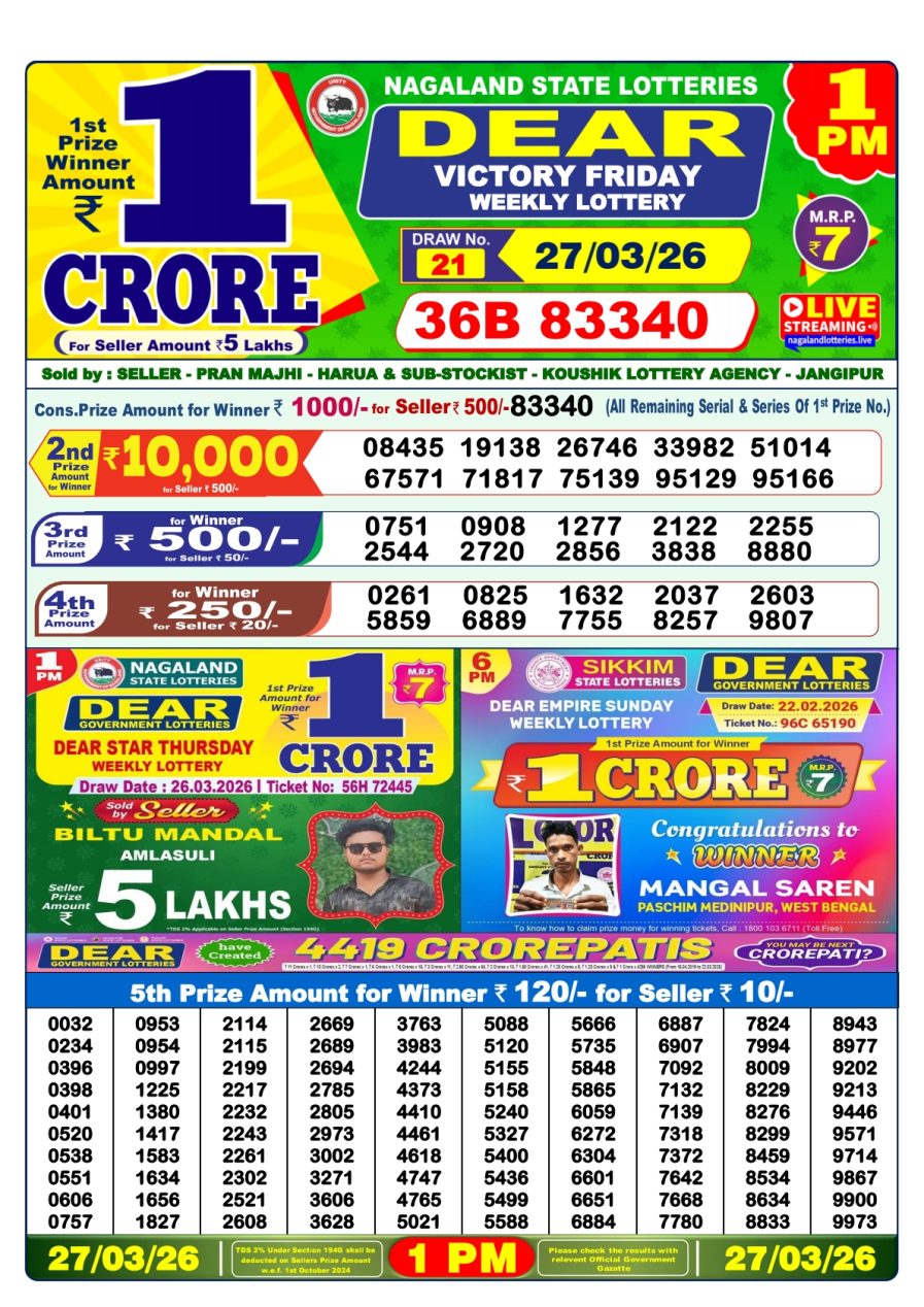 Nagaland State Dear Lottery Result Declared 1PM 27/03/2026 March 27, 2026 Leave a Comment on Nagaland State Dear Lottery Result Declared 1PM 27/03/2026 Posted in Lottery Results