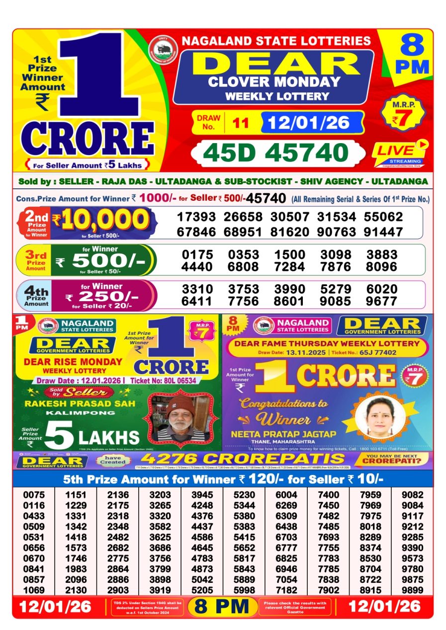 Nagaland State Dear Lottery Result Declared 8PM 12/01/2026 January 12, 2026 Leave a Comment on Nagaland State Dear Lottery Result Declared 8PM 12/01/2026 Posted in Lottery Results