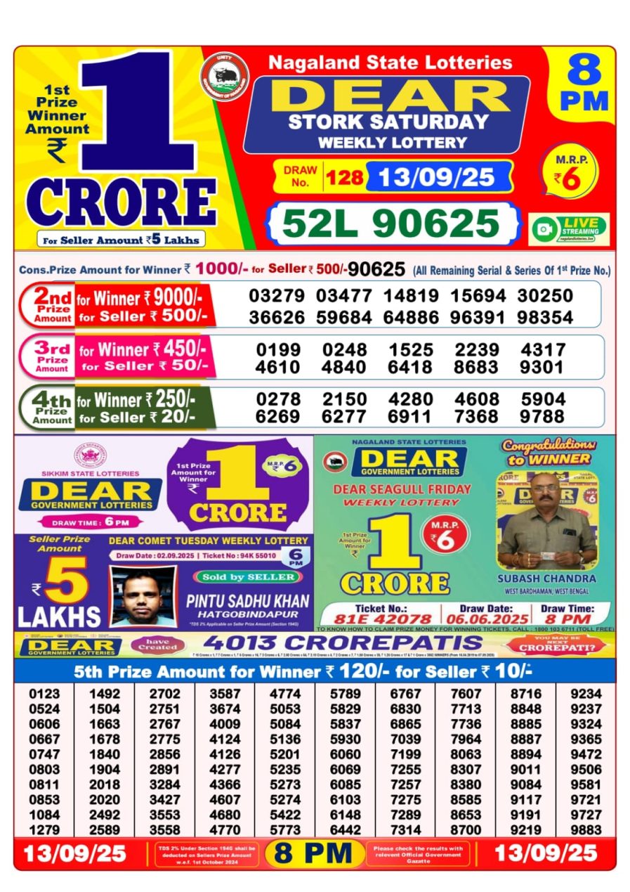 Nagaland State Dear Lottery Result Declared 8PM 13/09/2025 September 13, 2025 Leave a Comment on Nagaland State Dear Lottery Result Declared 8PM 13/09/2025 Posted in Lottery Results