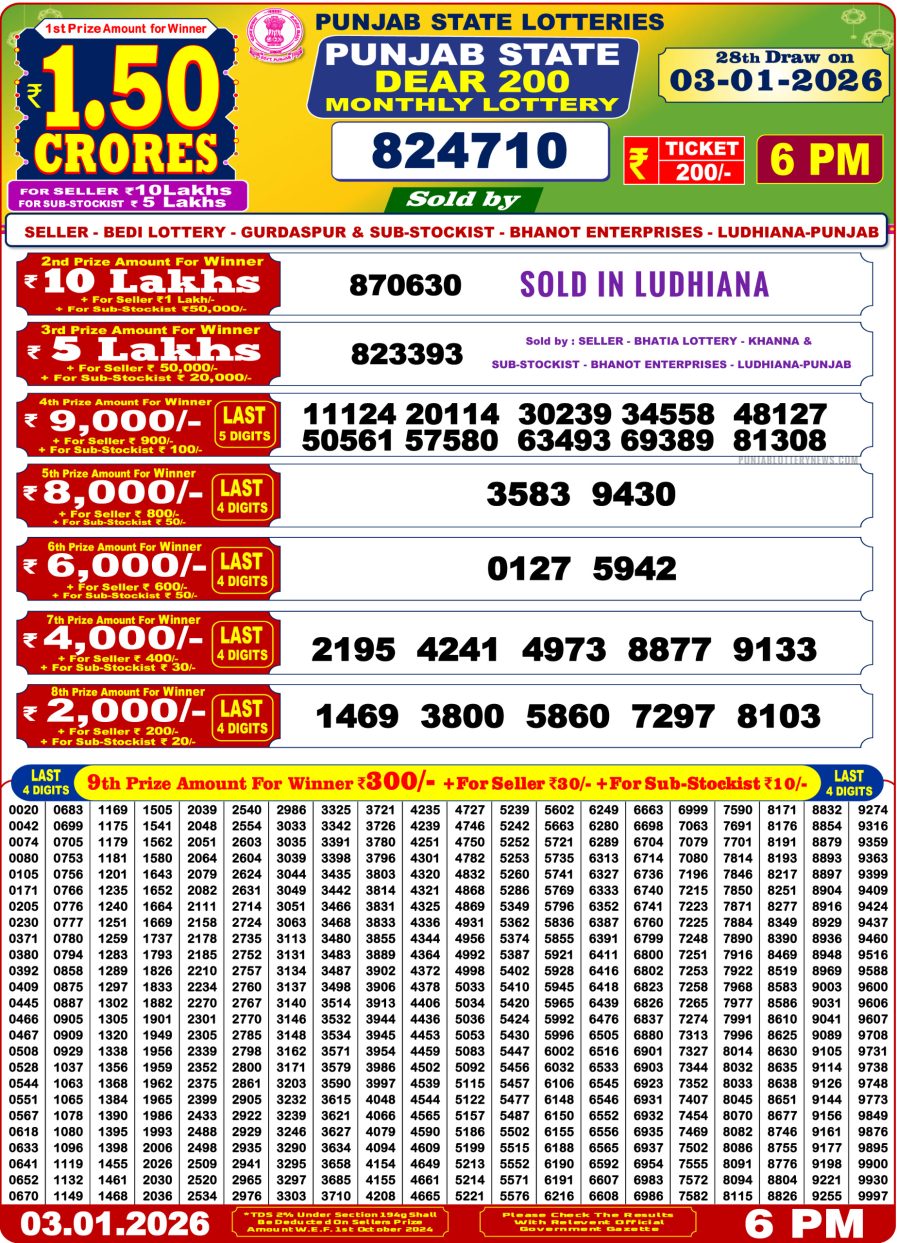 Punjab State Dear 200 Monthly Result 03/01/2026 Live January 3, 2026 Leave a Comment on Punjab State Dear 200 Monthly Result 03/01/2026 Live Posted in Lottery Results
