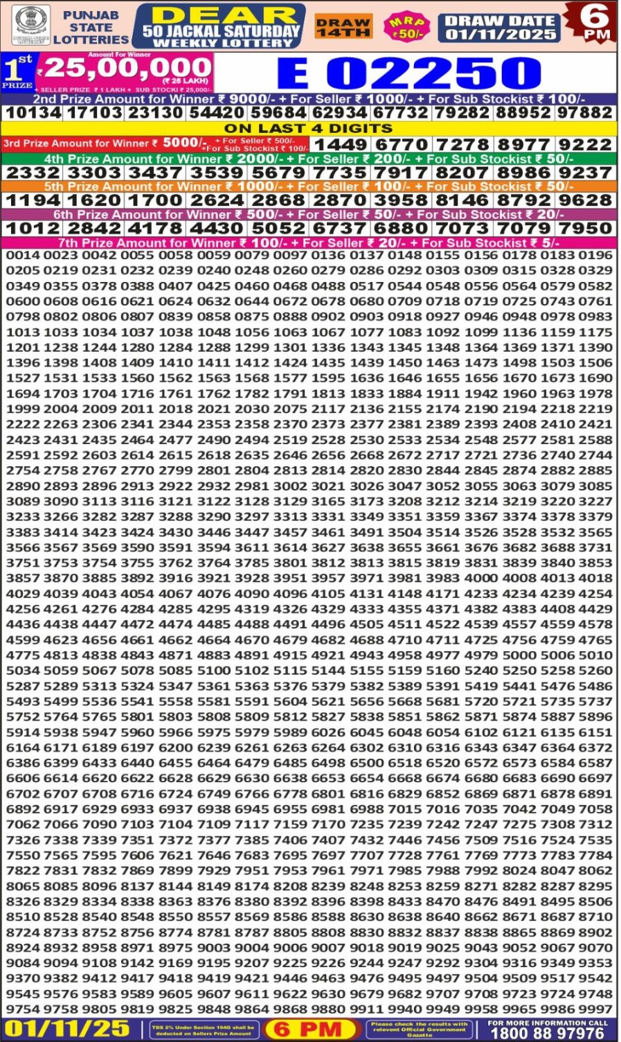 Punjab State Dear 50 Lottery Result 6PM 01/11/2025 November 1, 2025 Leave a Comment on Punjab State Dear 50 Lottery Result 6PM 01/11/2025 Posted in Lottery Results