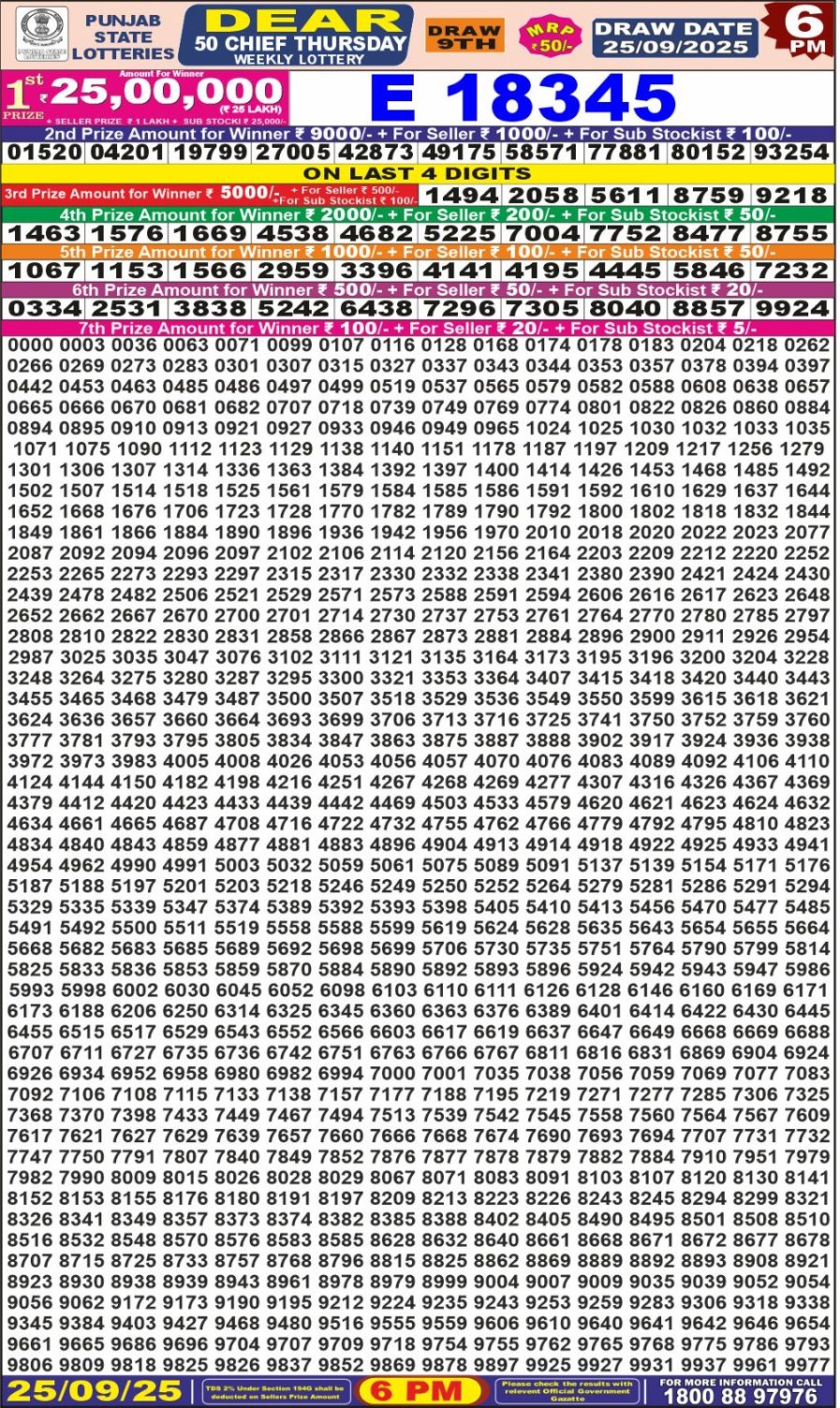 Punjab State Dear 50 Lottery Result 6PM 25/09/2025 September 25, 2025 Leave a Comment on Punjab State Dear 50 Lottery Result 6PM 25/09/2025 Posted in Lottery Results